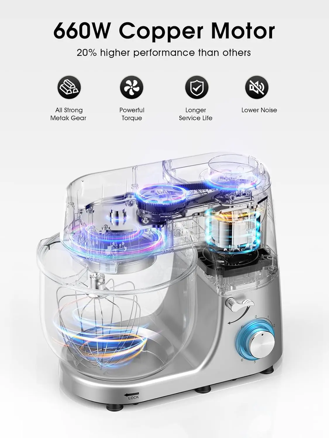 Upgrade your kitchen with this powerful 9.5 QT stand mixer, perfect for all your baking needs. The mixer features six adjustable speeds plus a pulse function for precise mixing control. Equipped with a tilt-head design, it allows easy access to the mixing bowl and attachments. Dual handles provide secure and convenient handling of the large 9.5-quart bowl. The 660W motor delivers consistent power for mixing dough, batter, and more. Dishwasher-safe bowl ensures easy cleaning and maintenance. Ideal for home bakers and small commercial kitchens alike. Durable construction guarantees long-lasting performance. Perfect for kneading, whipping, and blending a variety of ingredients. Make baking and cooking easier, faster, and more enjoyable with this versatile stand mixer.
