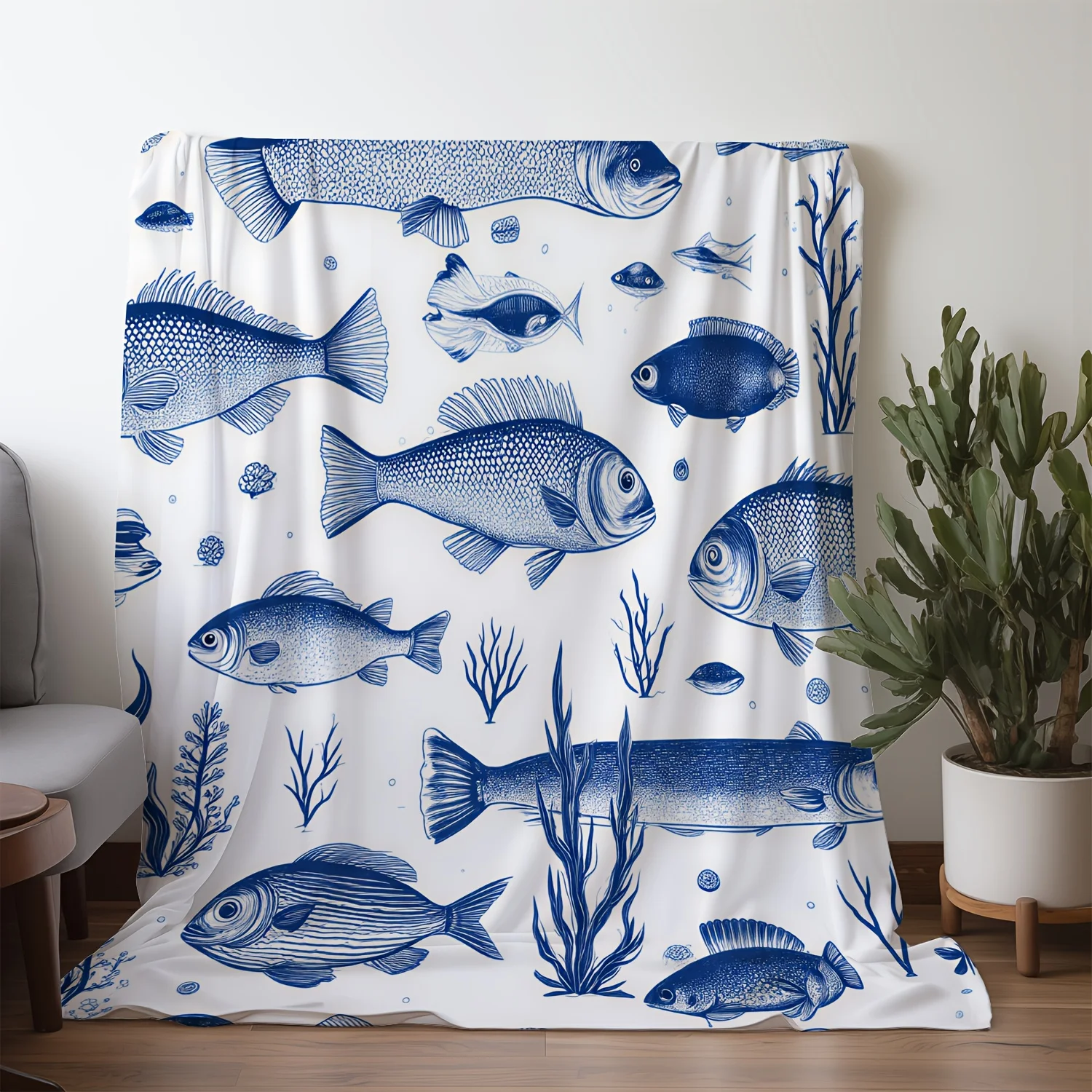 This soft blue blanket features a charming fish and seaweed print, adding a playful touch to any room. Made from durable polyester fabric, it is lightweight yet warm. Machine washable for easy cleaning and maintenance. Ideal for use in bedrooms, living rooms, or as a decorative throw. Soft and cozy, perfect for curling up on sofas or beds. Durable construction ensures long-lasting comfort and vibrant prints. Lightweight and easy to fold or store when not in use. Adds both style and functionality to your home décor. Suitable for daily use or as a thoughtful gift. Practical, decorative, and comfortable, this blanket enhances warmth and aesthetics in any space.