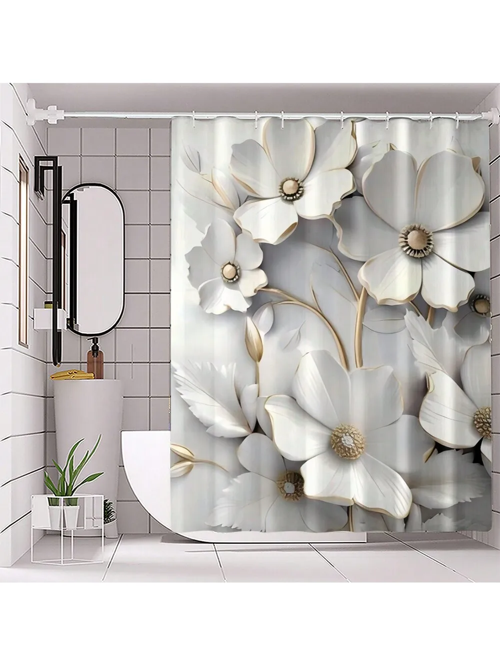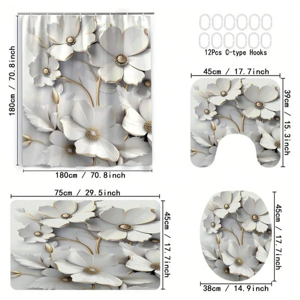 Refresh your bathroom with this elegant floral pattern bathroom accessory set. The set includes a shower curtain, a toilet seat cover, a U-shaped mat, and a bath mat for a complete matching look. Designed with a vibrant spring-inspired floral print, it brings a cheerful and fresh touch to any bathroom. The shower curtain is made from durable, waterproof material to keep water contained. The non-slip mats provide safety and comfort for everyday use. Easy to install with included hooks and suitable for most standard bathrooms. Machine washable for simple maintenance and long-lasting beauty. Soft yet durable, perfect for home, guest bathrooms, or apartments. The coordinated design creates a cohesive and stylish bathroom décor. Add a touch of seasonal charm and functionality with this complete floral bathroom set.