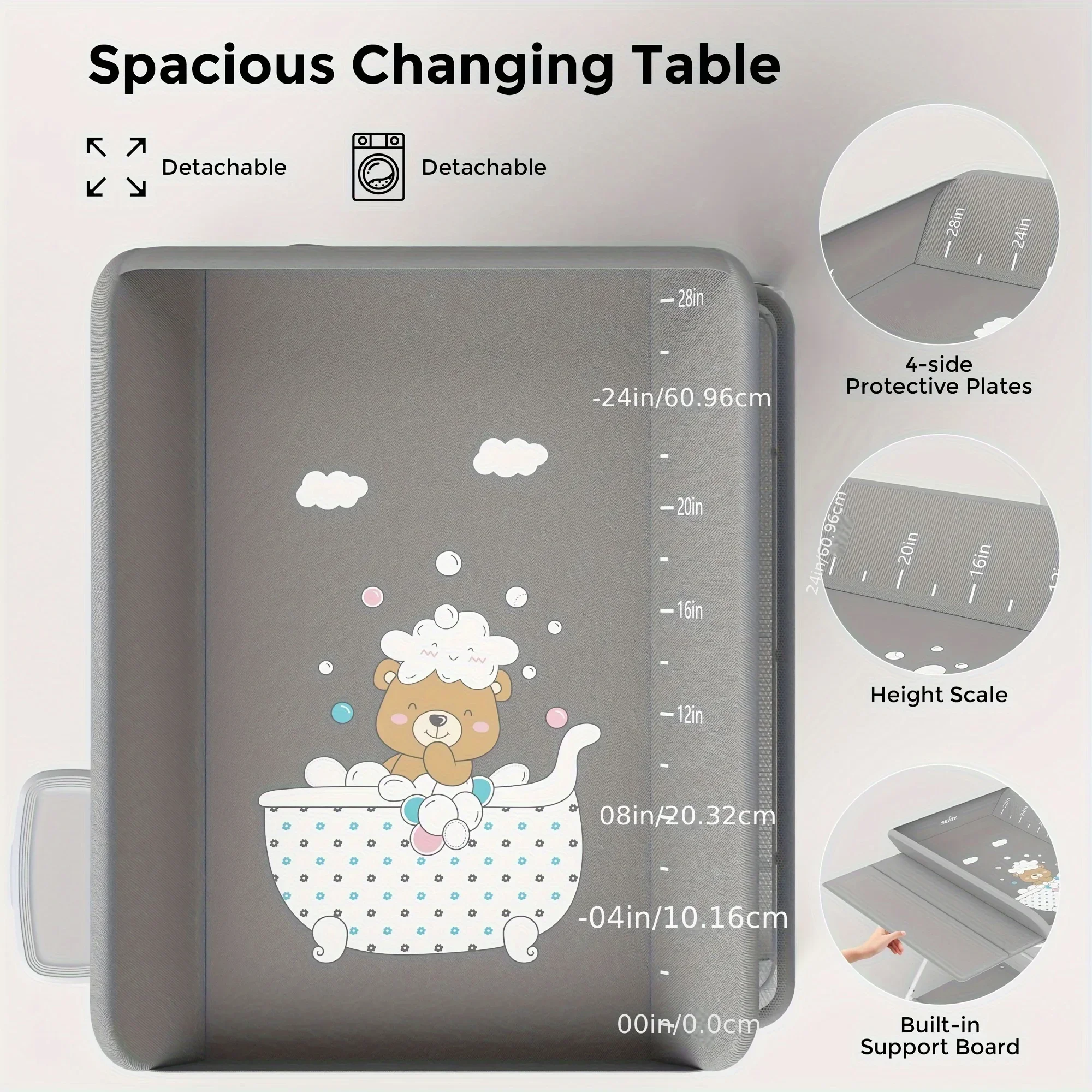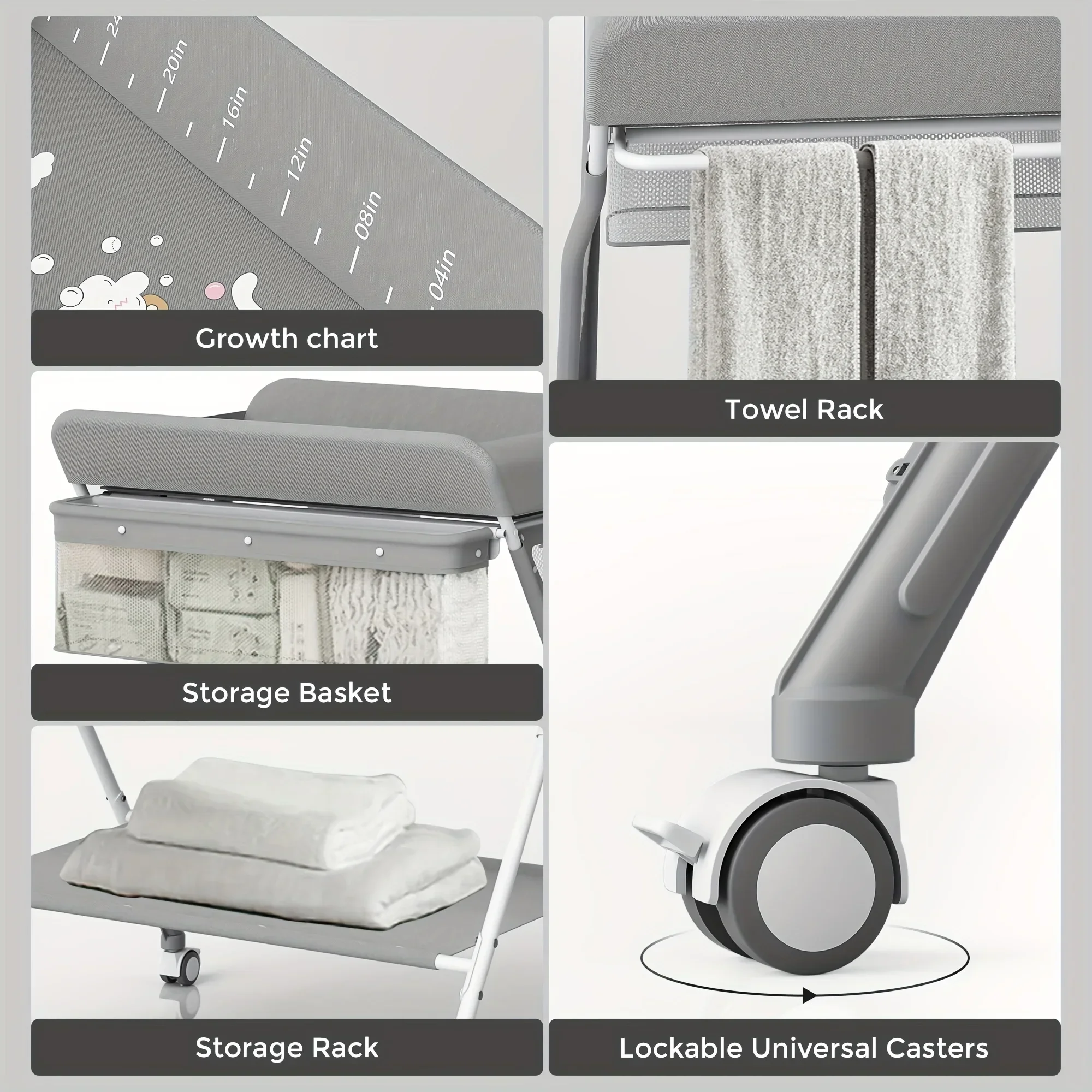 This foldable baby changing table offers a practical and comfortable space for diaper changes. Designed with a sturdy frame, it provides stability and safety for your baby. The foldable design allows for easy storage when not in use. Equipped with wheels, it can be moved effortlessly around the home. A bottom rack and side basket offer convenient storage for diapers, wipes, and baby essentials. The built-in clothes rail keeps outfits and towels within reach. Made from durable, easy-to-clean materials, it ensures long-lasting use. The ergonomic height reduces back strain for parents during diaper changes. Ideal for newborns and infants, it fits perfectly in any nursery. This versatile changing table combines function, mobility, and style for everyday care.