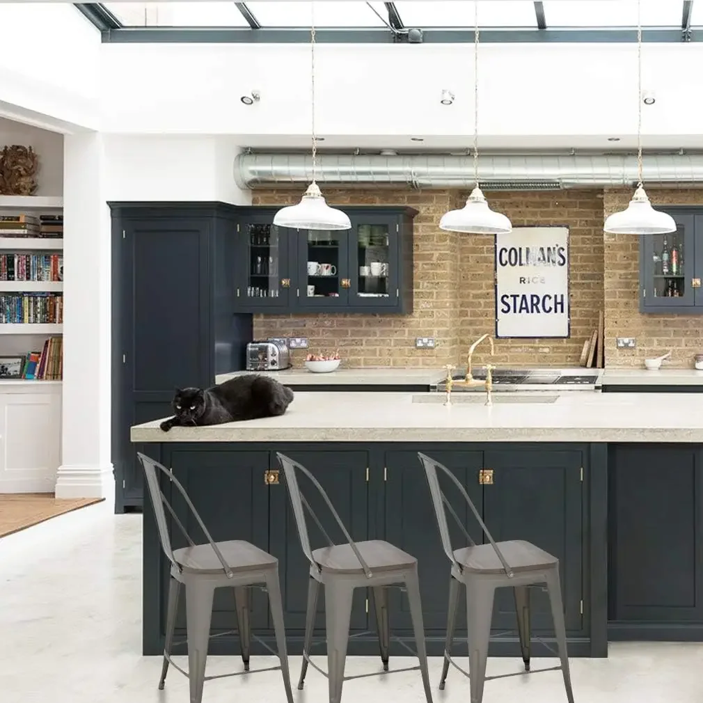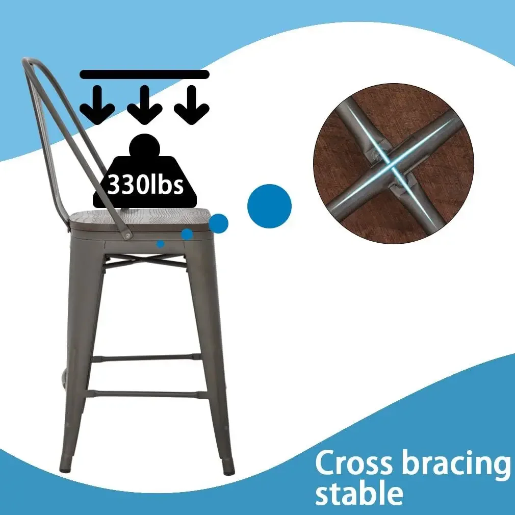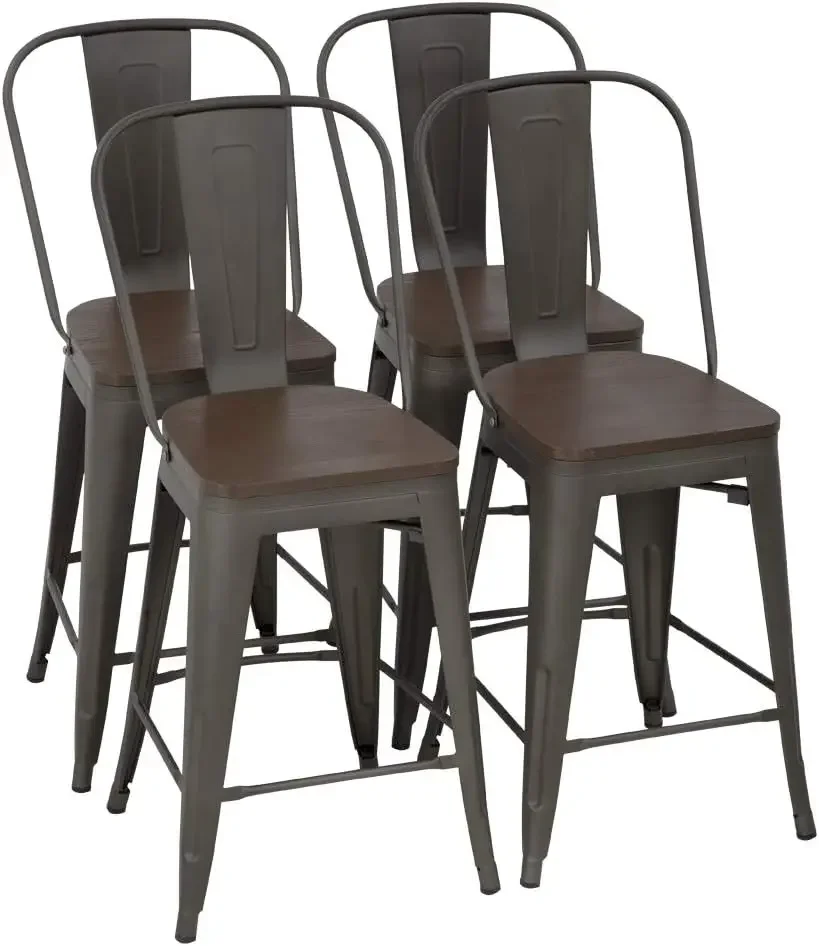 Upgrade your kitchen, bar, or patio with this set of 4 industrial metal bar stools. Designed with a sturdy metal frame, these stools offer long-lasting durability and stability. Each stool features a supportive backrest for comfortable seating during meals or social gatherings. The 24-inch seat height makes them ideal for kitchen islands, breakfast bars, or home bars. Stackable design allows for easy storage and saves space when not in use. The sleek industrial style complements modern, rustic, and contemporary décor. Lightweight yet strong, these stools are easy to move and reposition as needed. Perfect for indoor or outdoor use, including patios, bars, or dining areas. The minimalist design pairs functionality with aesthetic appeal. A versatile and stylish seating solution for any home or commercial space.