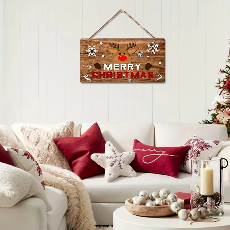 This rustic Christmas sign adds a warm and festive touch to your holiday décor. Featuring bold red “Merry Christmas” lettering on a brown background, it creates a classic seasonal look. The design includes charming reindeer and snowflake details for extra holiday spirit. Its flat 2D style makes it easy to display on walls, doors, or shelves. The natural rustic finish complements farmhouse, vintage, and traditional holiday themes. Lightweight and durable, it is simple to hang and reuse every year. Perfect for living rooms, kitchens, or entryways, it welcomes guests with seasonal cheer. The sign also makes a thoughtful Christmas gift for friends and family. Its timeless style ensures it stays a staple in your holiday decorations. Add this rustic Christmas sign to your home for a cozy and festive atmosphere.
